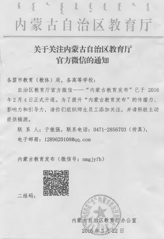 现将《关于关注内蒙古自治区教育厅官方微信的通知》转发给大家,请各单位、部门认真组织师生员工添加关注,并积极提供稿源。