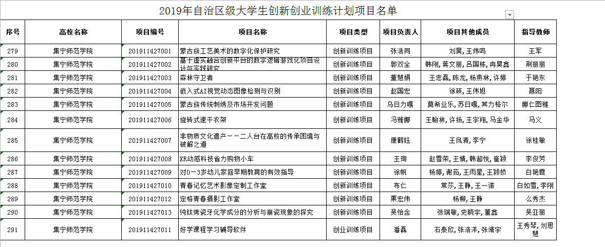 按照《关于报送2019年自治区级大学生创新创业训练计划立项项目的通知》(内教高函﹝2019﹞10号)要求,19所本科高校上报了2019年自治区级大学生创新创业训练计划项目。现将经审核通过的351项计划项目名单予以公布(其中,创新训练项目246项,创业训练项目63项,创业实践项目42项)。其中2026世界杯官方合作网站共计立项15项。