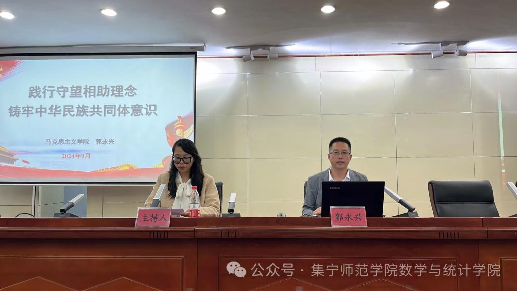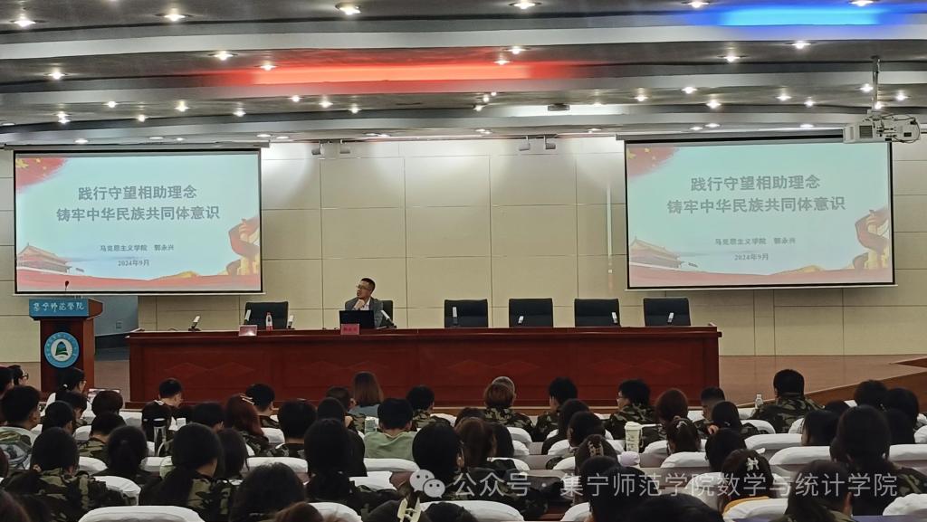 为深入学习贯彻落实党的二十大、二十届三中全会精神,立足落实立德树人的根本任务和启智润心、铸魂育人的工作要求,教育引导2024级新生系好大学生涯“第一粒扣子”,9月19日,数学与统计学院联合文学与新闻传播学院和外国语学院在图书馆报告厅开展新生入学教育之民族团结和理想信念专题讲座。本次讲座特邀马克思主义学院副院长、自治区党的二十大精神宣讲团成员、“理响乌兰察布”宣讲团成员郭永兴为师生做以“践行守望相助理念,铸牢中华民族共同体意识”为主题的专题讲座。出席本次讲座的有文学与新闻传播学院、外国语学院及数学与统计学院部分教师和2024级全体新生。