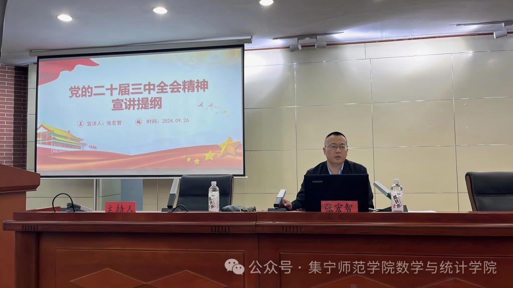 为全面贯彻落实习近平新时代中国特色社会主义思想,深入学习贯彻党的二十届三中全会精神,9月26日,数学与统计学院在图书馆报告厅开展党的二十届三中全会精神宣讲报告会。学院党总支书记张宏智为本次报告会作宣讲。报告会由学院党总支副书记常鑫主持,数学与统计学院全体在校学生参加了报告会。