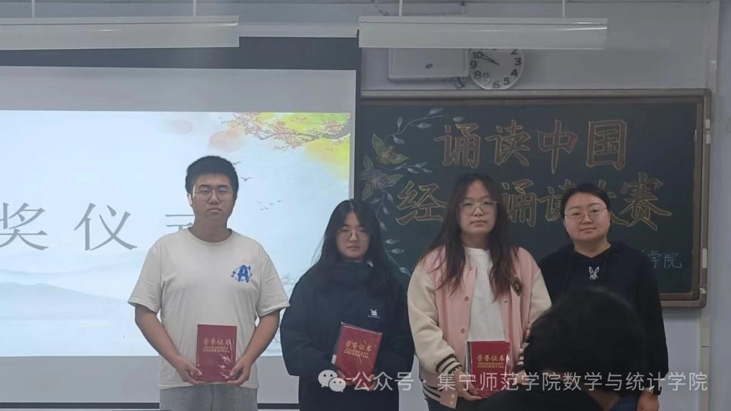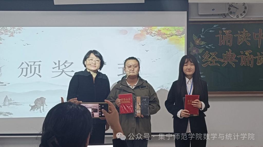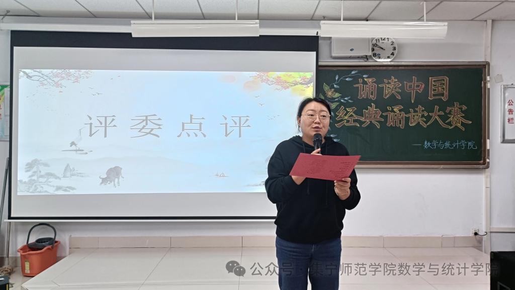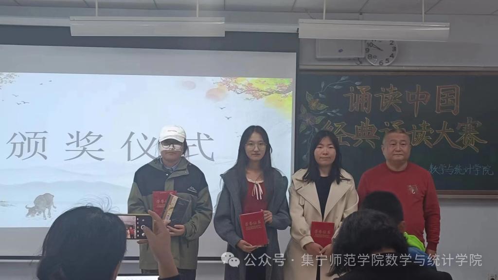 为贯彻落实党的二十届三中全会精神,加强服务教育强国、文化强国建设,加大国家通用语言文字推广力度,传承发展中华优秀语言文化,发扬中华经典诵读文化,数学与统计学院于9月29日在逸夫楼2Y301举办以“诵读中国”为主题的经典诵读大赛。出席本次比赛的有办公室主任任立华、团学办主任高霞、辅导员刘紫玉。