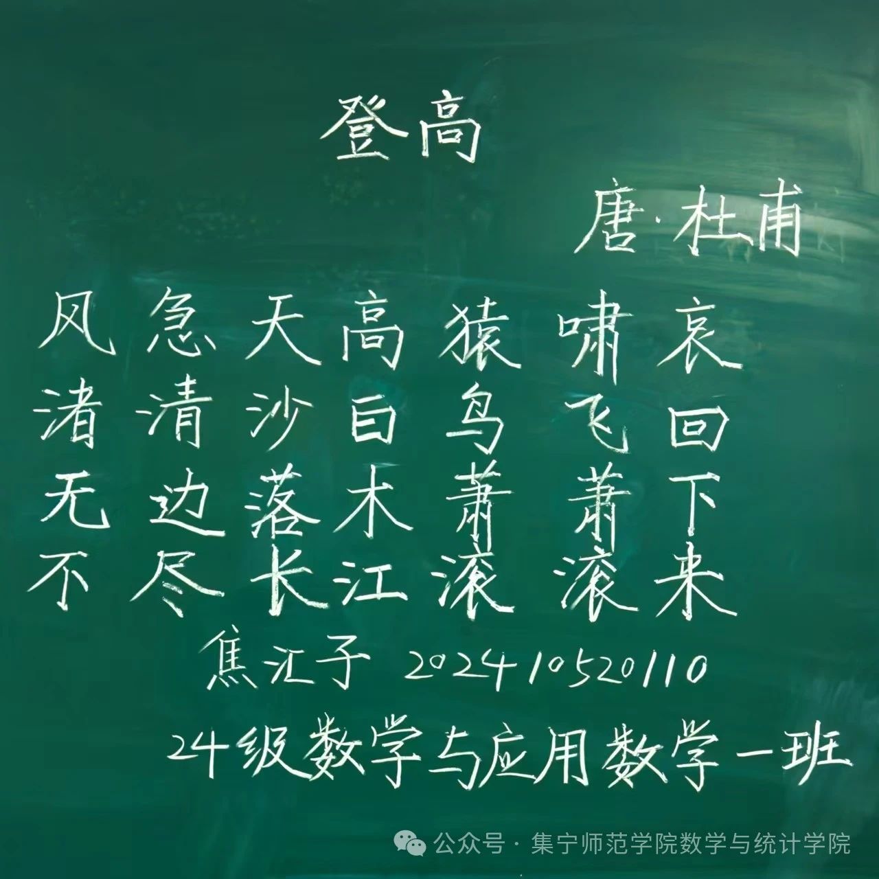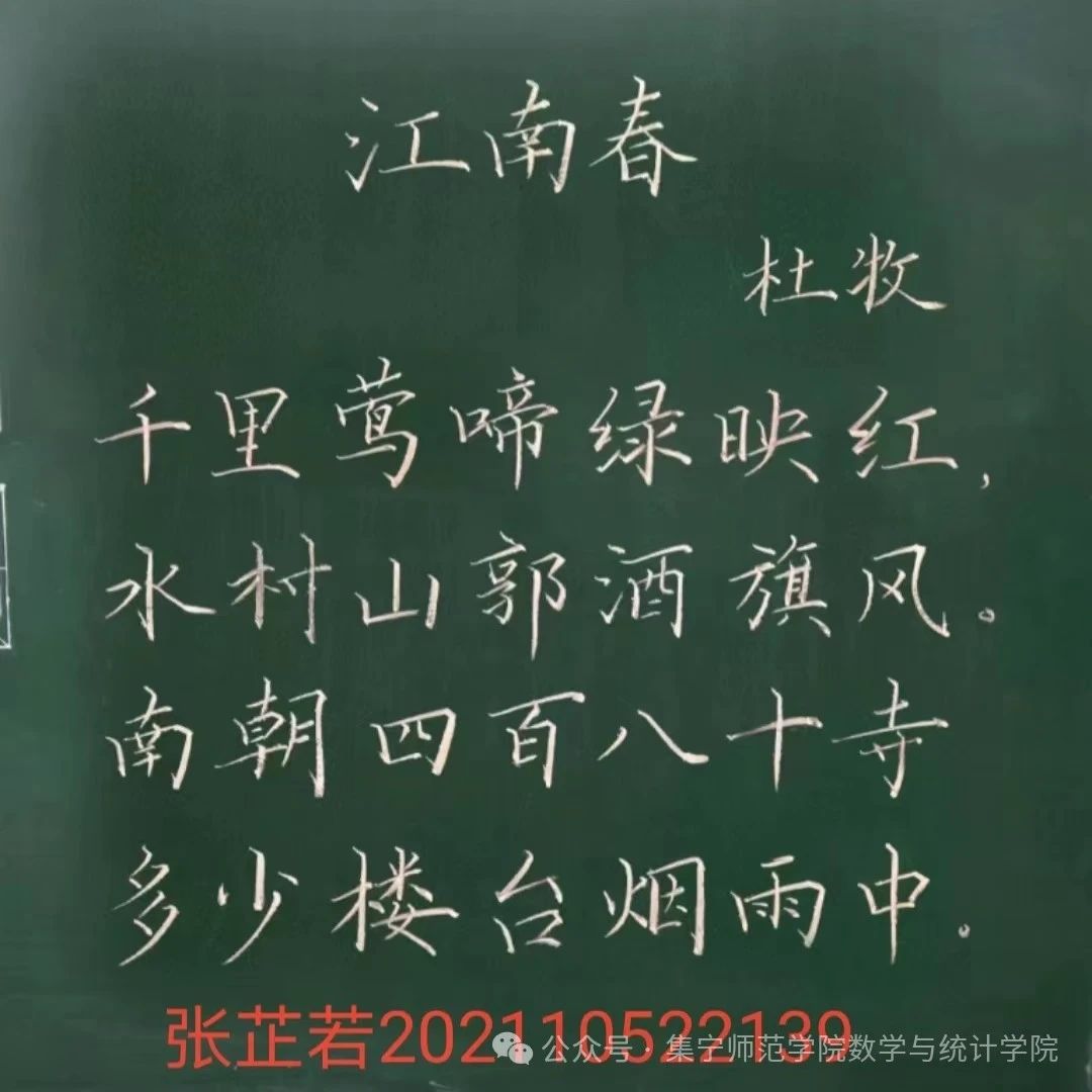粉笔书法部分焦汇子、张芷若荣获一等奖,推荐2024级数学与应用数学一班焦汇子进入校赛。