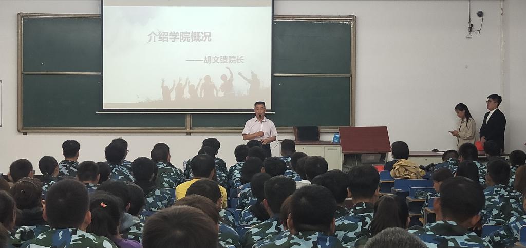 首先,胡文弢院长代表学院领导以及全院师生员工向2019级新生表示了衷心的祝贺和热烈的欢迎,接着胡教授为同学们详细地介绍了物理学院的概况。并对广大新生在军训中的表现给予了肯定,希望他们能继续发扬军训期间吃苦耐劳的精神,以饱满热情迎接以后的大学生活,加强专业素质,学会独立、学会创新,树立正确的世界观,肩负起国家赋予同学们的使命与职责,力争成为中国特色社会主义的合格建设者和可靠接班人。
