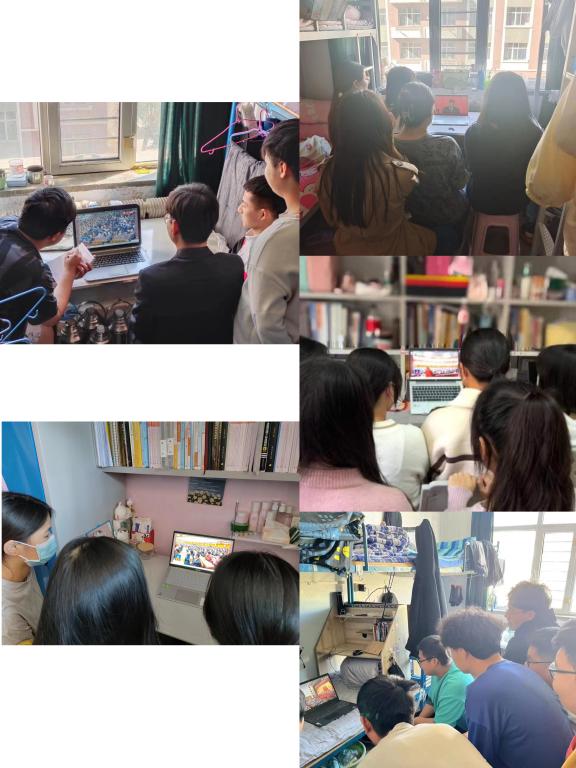学生以宿舍为单位集中收看中国共产党第二十次全国代表大会开幕会实况。