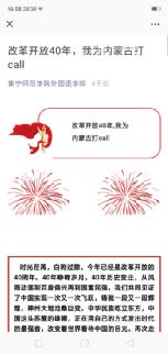 在本次宣传活动中,我院在公众号上发表了题为“改革开放四十年,我为内蒙古打call”的文章,文章中生动详细地介绍了中国在许多领域从无到有,由弱到强的历史进程,让我们从一些短片中感受到了中华民族从站起来,富起来到强起来的伟大飞跃。1978到2018转眼已是40年,四十年前的一个伟大决定让中国步入了日新月异的快车道,抚今追昔我们深感中国的巨大发展。我院学生积极留言点赞。