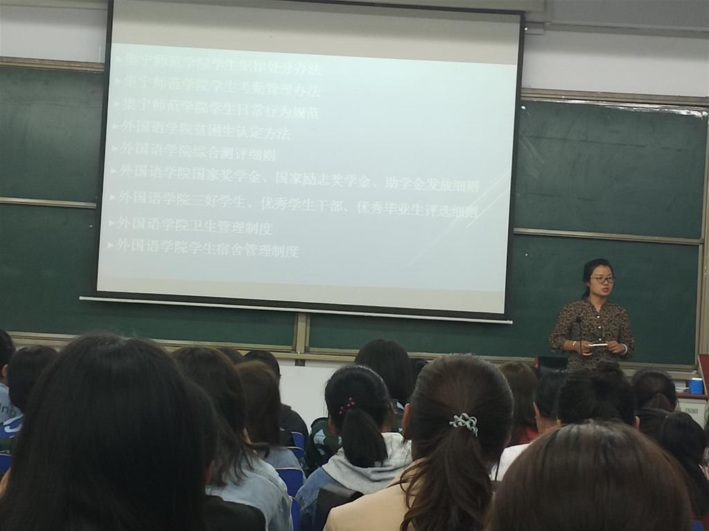 首先我院学工办主任刘翠娟老师就学生管理作了专门讲座。刘翠娟老师对我院做了简单介绍,并就学院内各职能部门各自负责的职责给学生做了详细的讲解,同时刘翠娟老师对我院学生管理方面的规章制度做了讲解,最后结合如何更好地适应大学生活,刘老师希望同学们在遵守规章制度的前提下,站在新的起点上,不忘初心,牢记使命,砥砺前行,继续创造大学四年属于自己的辉煌。