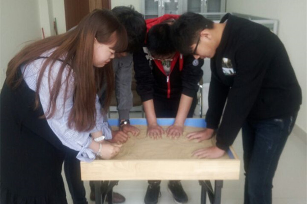 本次沙盘游戏包括两个阶段,第一阶段为个体沙盘游戏,第二阶段为团体沙盘游戏。指导老师首先介绍了沙盘游戏的相关知识和规则,让同学们用手去触摸沙子,用心感受沙子带给人的包容、细腻、舒服的感觉。作品完成后,同学们在老师的引导下分享自己的体验,并为自己的沙盘作品取了饱含深意的名字。团体沙盘游戏过程中,通过非语言的沟通方式,成员们感受着彼此间的和谐和冲突,也开始逐步思考自己在团体中的角色定位,觉察自己在团体合作中的优点以及需要改进的地方。