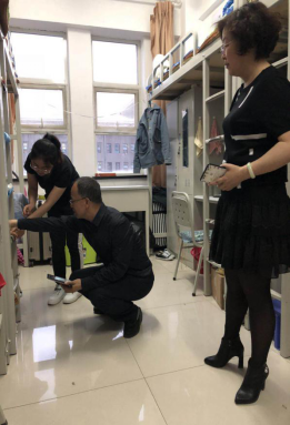 (图为曹宇院长、云利英老师参与宿舍评比)