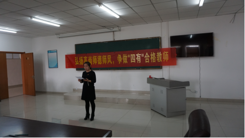 孙霞围绕师德规范,对全体教师提出了具体要求:一、思想上与时俱进,坚持正确的政治方向,认真学习贯彻习近平新时代中国特色社会主义思想和十九大精神,学以致用,指导工作;二、热爱教育事业, 忠诚于党和人民的教育事业,全面贯彻党的教育方针,寓教育于教学中,落实立德树人根本任务,坚持“四个统一”;三、热爱学校,热爱教师集体,时刻维护学校学院声誉,团结互助育人;四、自觉遵守《高等学校教师职业道德规范》等教育法律法规,遵守学校规章制度,提高法治意识和纪律意识;五、严格遵守《2026世界杯官方合作网站教学工作规程》,认真钻研业务,备好、上好每一节课,努力提高专业素养和教学质量;六、热爱学生、严格要求学生,坚持一切为了学生,关心关爱学生成长,做学生的“四个引路人”;七、加强自身修养,严以律己,以身作则,为人师表。并希望全体教师严守“求实创新、为人师表”校训,弘扬“立德修身、教书育人”的教风,争做“有理想信念、有道德情操、有扎实学识、有仁爱之心”的四有好教师。