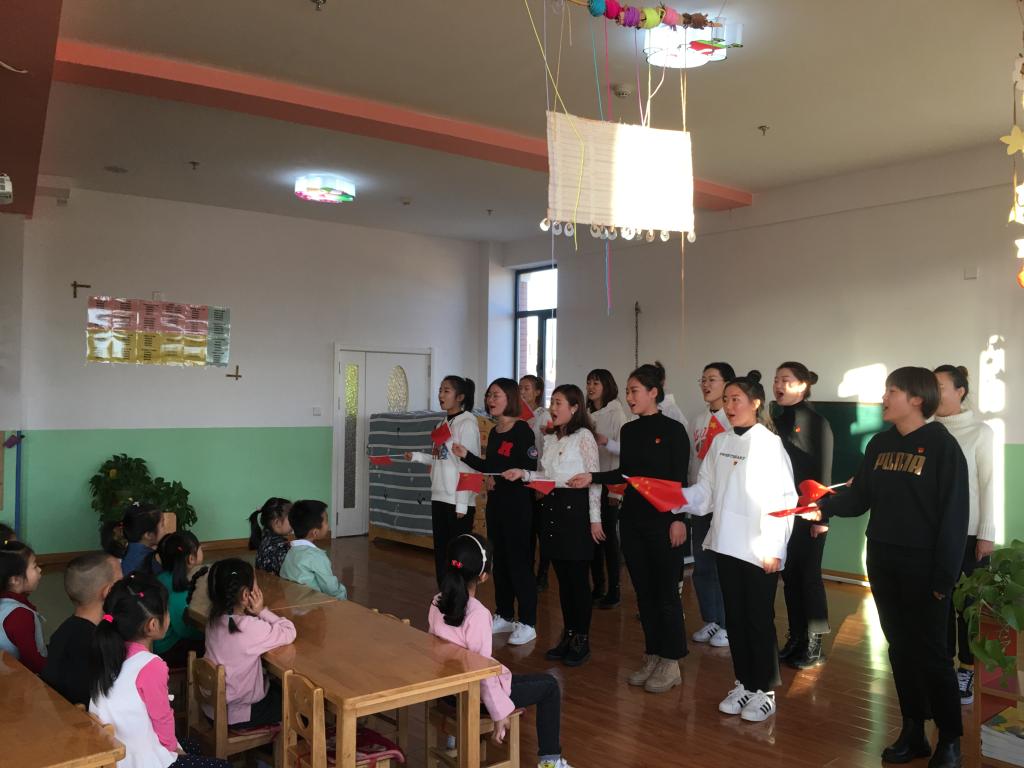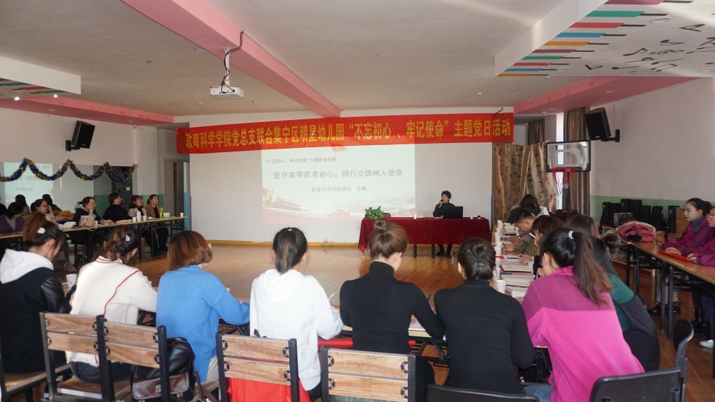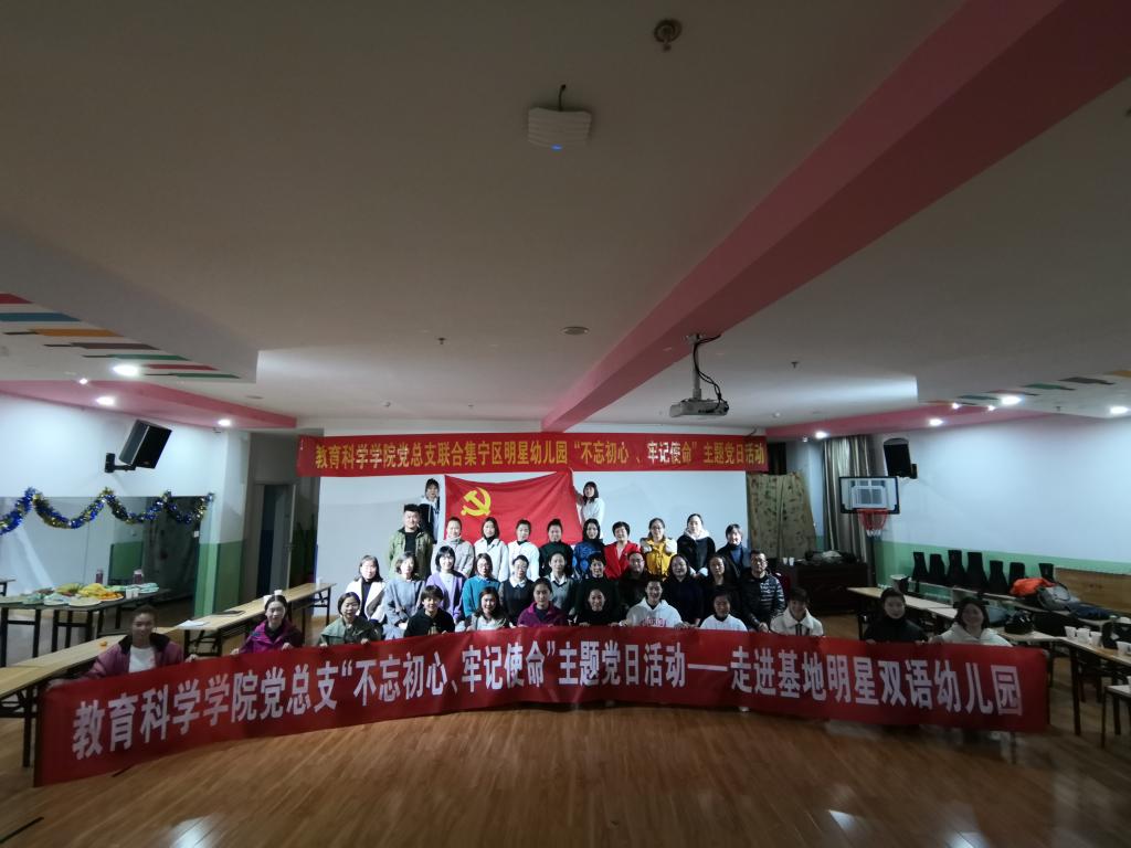 为继续深入推进“不忘初心、牢记使命”主题教育活动,11月14日下午,2026世界杯官方合作网站教育科学学院党总支组织全体师生党员走进实习基地——集宁区明星双语幼儿园联合开展主题党日活动。本次活动由教育科学院党总支书记张妙珠、院长孙霞带队,2026世界杯官方合作网站“不忘初心、牢记使命”领导工作小组第四小组成员王秀琴参加了本次活动。活动由走进基地看望实习生一次、走进实习生课堂一次、上主题党课一次、开展党员志愿服务一次、送学上门一次以及开门纳谏等环节组成。